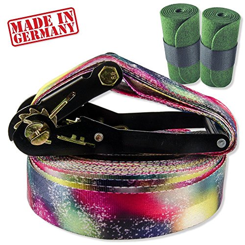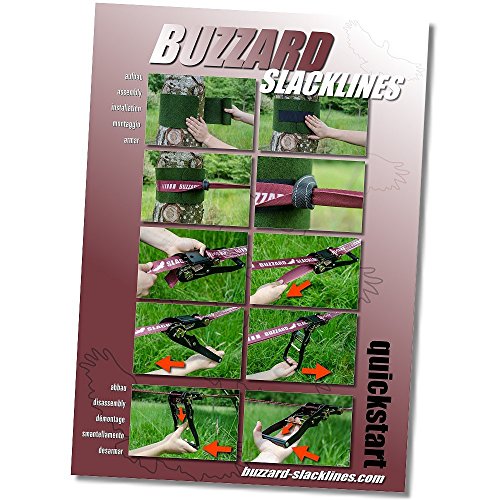 Die BUZZARD Splash-Slackline im Set. Dazu gehören die Slackline mit Befestigungsschlaufe und eine am Gurt befestigten Ratsche, mit der man die Line supereinfach aufspannen kann. Durch das weiche und trotzdem feste Bandmaterial ist Barfußlaufen auf der Splashline ein wahrer Genuss. Im Set enthalten sind außerdem zwei Baumschoner, mit denen die empfindliche Baumrinde geschützt wird. Zudem verlängert sich bei Benutzung der Baumschoner auch die Lebensdauer Ihrer Slackline. Die BUZZARD Splash-Slackline ist schnell und sicher im Aufbau, dank der bebilderten Montageanleitung.