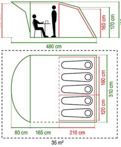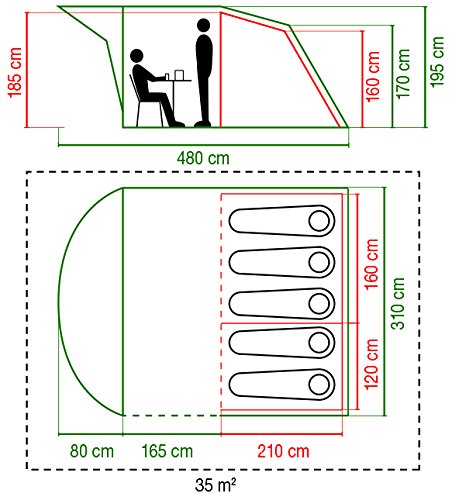 2 eingehängte Schlafkabinen. Kleines Vordach circa“ 80 cm lang. Reflektierende Abspannseile, Regenschürze und Fiberglasgestänge. Die Nähte sind geklebt und tragen zu einer besseren Wasserdichtheit bei