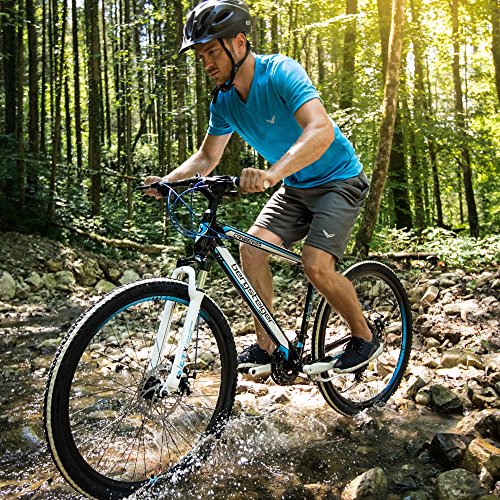 Das Mountainbike Bergsteiger Canberra 29 Zoll ist ab einer Körpergröße von ca. 160 cm für Jungen und Herren geeignet. Sowohl auf asphaltierten Arbeits- und Schulwegen als auch auf hügeligen sowie verwurzelten Waldwegen sorgt dieses Modell für eine sichere Fahrt.