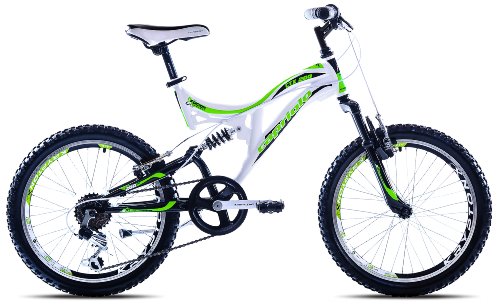 Wir bieten Ihnen hier ein vollgefedertes Markenmountainbike aus dem Hause Capriolo an. Dieses Kindermountainbike steht den großen in Nichts nach. Das Fahrrad ist für Kinder ab sechs Jahren mit einer Körpergröße von 115-140 cm geeignet. Der Rahmen ist vollkommen alltagstauglich, hält aber auch stärkeren Beanspruchungen spielend stand. Die Rahmenfederung bietet Ihnen die Möglichkeit, das Fahrrad optimal auf die Bedürfnisse des Kindes anzupassen. Durch die zusätzliche Gabelfederung werden auch stärkere Schläge problemlos abgefedert. Viele Markenkomponenten in Verbindung mit dem stabilen Rahmen sorgen für eine ausreichende Langlebigkeit. Dieses 20″ Mountainbike für Kinder gehört wohl zu den coolsten sich am Markt befindlichen Fahrrädern dieser Altersklasse.