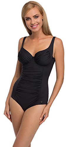 Badeanzug mit schönen Falten vorne, ideal für Frauen mit größerer Brust. Waagerechter und senkrechter Körbchenschnitt halten die Brust ideal und geben eine schöne Form. Die Drapierungen kaschieren Unvollkommenheiten. Das spanische Material Liquid® aus dem der Badeanzug hergestellt wurde, ist sehr glatt, leicht und weich, verliert dabei aber nicht die Widerstandsfähigkeit und Elastizität. Es trocknet schnell und ist geschmeidig. Der ganze Badeanzug ist gefuttert. Vorderer und hinterer Teil mit einem elastischen Netz gefuttert. Hinten weiche Fütterung. Der Badeanzug wurde aus einer figurformenden Technologie mit Anwendung eines speziellen Schnitts, eines verstärkten Netzes und einer elastischen Fütterung angefertigt. Dank dessen passt sich der Badeanzug der Figur an und kaschiert Unvollkommenheiten. Badeanzug passt zu Frauen mit Rundungen. Größen 40-52. Die Farben können leicht von den auf dem Monitor dargestellten Farben abweichen. Materialzusammensetzung: 80% Polyamid, 20% Elasthan